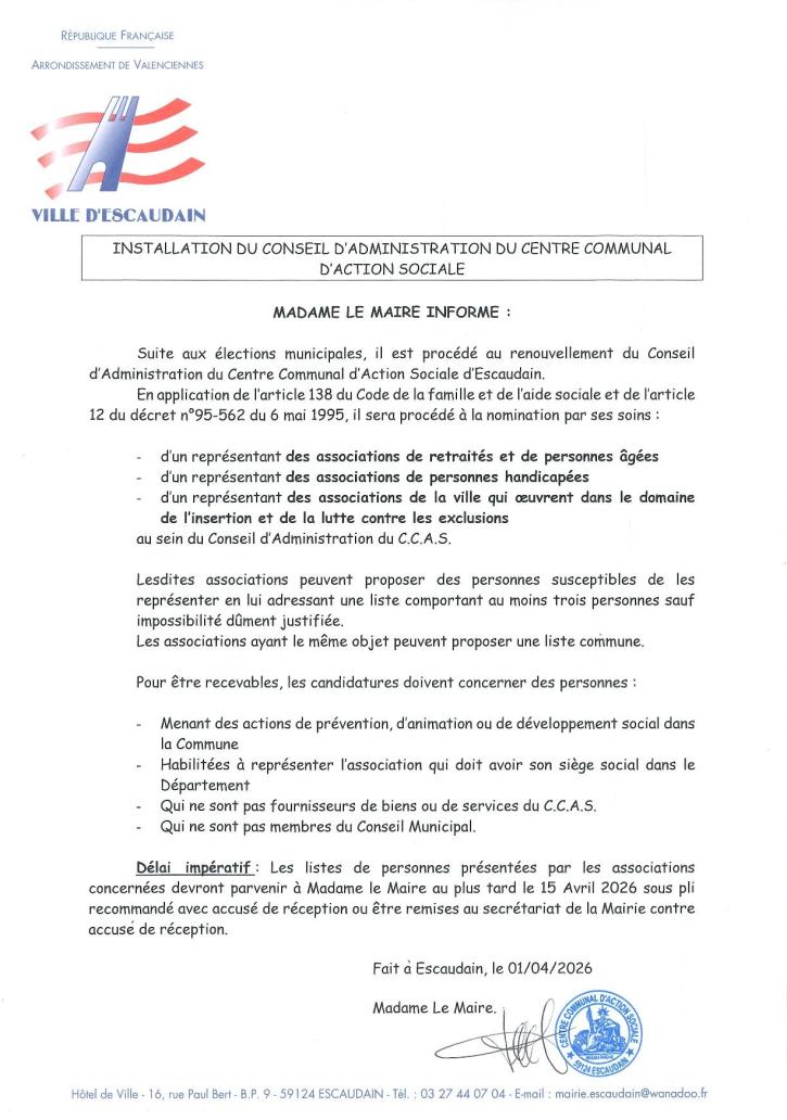 A la suite de l’installation du Conseil Municipal, la Ville d’Escaudain procède à l’installation du Conseil d’Administration du Centre Communal d’Action Sociale.